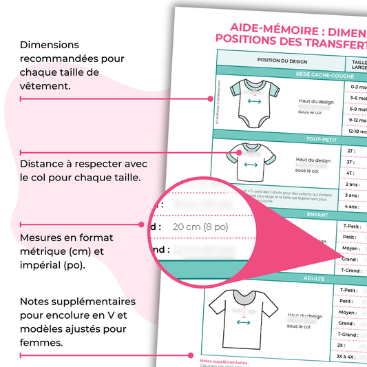 Aide-mémoire Cricut - Dimensions et positions des transferts à chaud